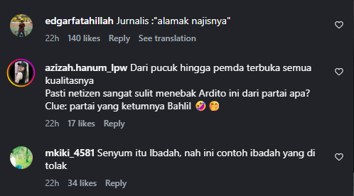 - Warganet lain, @azizah.hanum_lpw, menyoroti kualitas pejabat, “Dari pucuk hingga pemda terbuka semua kualitasnya. Pasti netizen sangat sulit menebak Ardito ini dari partai apa? Clue: partai yang ketumnya Bahlil 🤣🤭”.