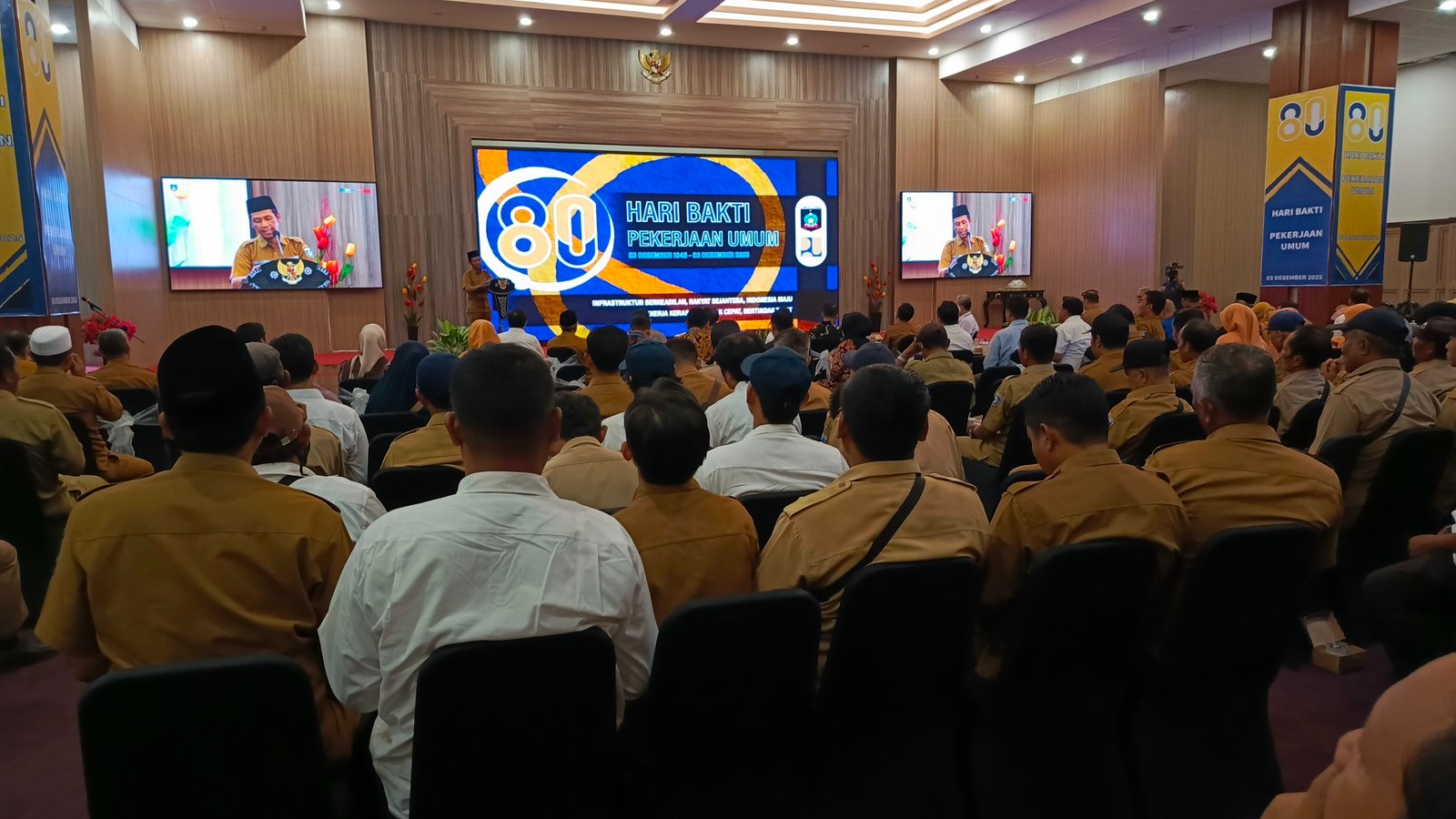 Lombok Tengah – Dinas Pekerjaan Umum dan Penataan Ruang (PUPR) Lombok Tengah peringati Hari Bakti Pekerjaan Umum (PU) ke-80 di Ballroom Kantor Bupati Lombok Tengah pada Senin, 8 Desember 2025.