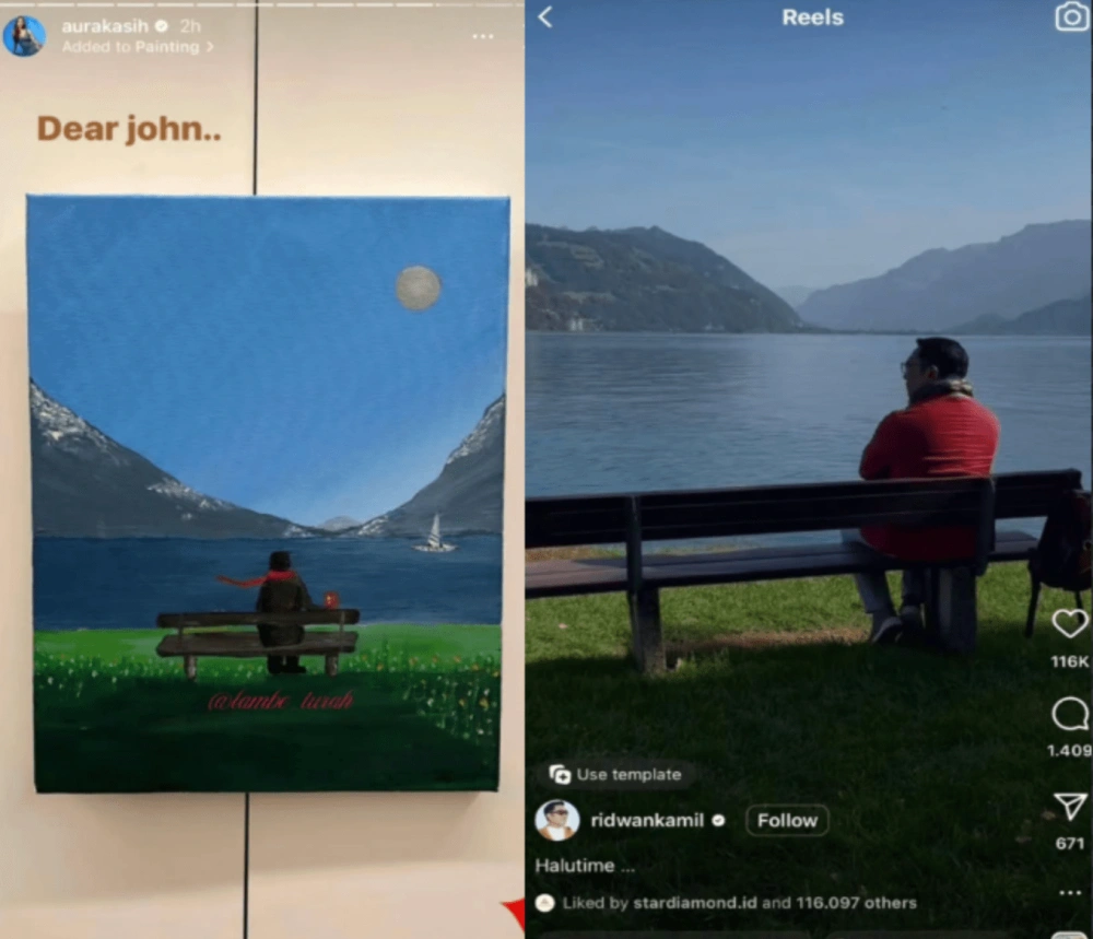Kebetulan atau kode tersembunyi? Netizen dibuat merinding dengan kemiripan presisi antara lukisan Aura Kasih dan potret Ridwan Kamil di tepi danau. Sebuah karya seni yang kini berubah menjadi teka-teki visual yang memancing ribuan tanya. Foto: Instagram