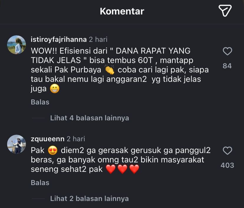 “WOW!! Efisiensi dari DANA RAPAT YANG TIDAK JELAS bisa tembus 60T, mantapp sekali Pak Purbaya 👏 coba cari lagi pak, siapa tau bakal nemu lagi anggaran2 yg tidak jelas juga 😁”.